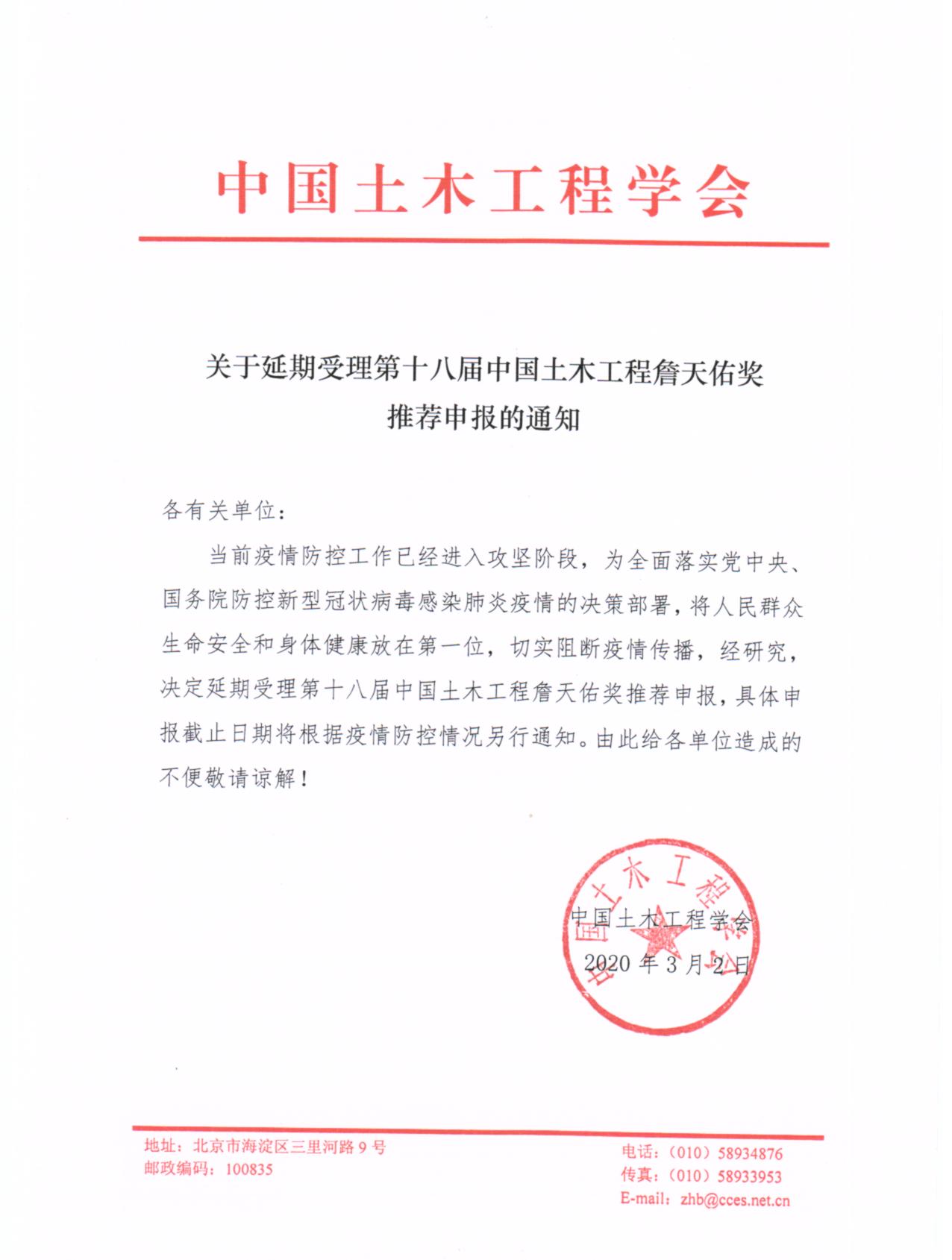 当前疫情防控工作已经进入攻坚阶段,为全面落实党中央、国务院防控新型冠状病毒感染肺炎疫情的决策部署,将人民群众生命安全和身体健康放在第一位,切实阻断疫情传播,经研究,决定延期受理第十八届中国土木工程詹天佑奖推荐申报,具体申报截止日期将根据疫情防控情况另行通知。由此给各单位造成的不便敬请谅解!
