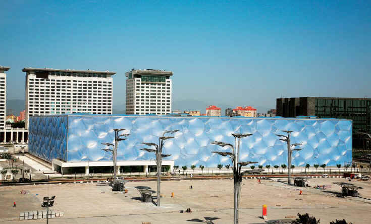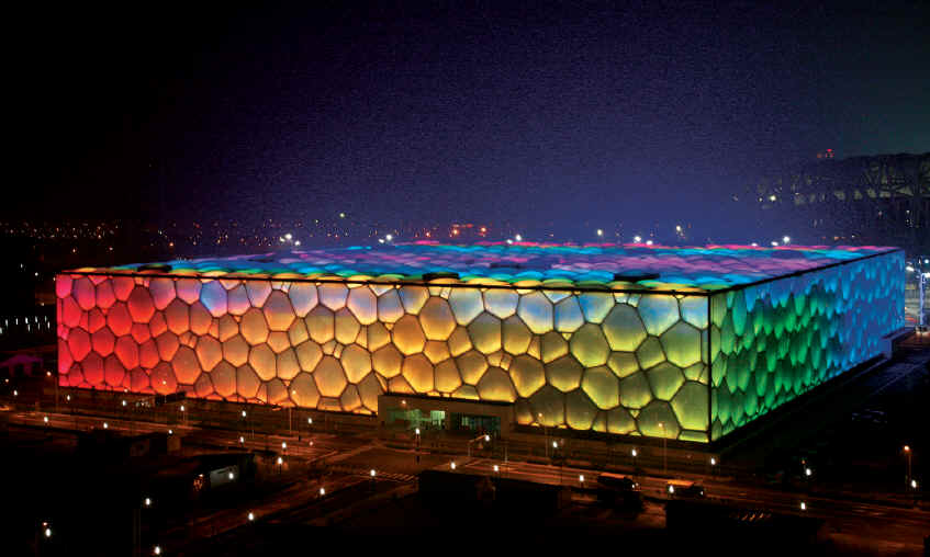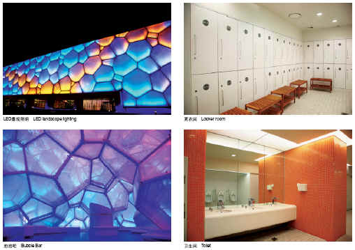 国家游泳中心工程位于奥林匹克公园B区,奥林匹克中心区西南角,主体建筑紧邻城市中轴线,并与国家体育场相对于中轴线均衡布置。东面为景观路,西侧为景观西路,南侧紧临北顶娘娘庙,北侧为成府路。工程占地62828m2,赛时建筑面积79532m2,标准坐席17000个,其中临时坐席约11000个(赛后将拆除),永久坐席约6000个。整个结构外形为立方体,平面尺寸为176.538m×176.538m,地上高度约31m。内部主要为钢筋混凝土结构,拥有1个标准竞赛池、1个标准热身池和1个标准跳水池及近5000m2的嬉水乐园。 主体地上一层,局部四层;地下二层。基础形式为桩支撑基础-无梁抗水板,混凝土部分为框架-多筒体抗震墙结构,上部结构为新型延性多面体空间刚框架结构,外墙体及屋盖被ETFE膜结构覆盖。地下建筑面积为57456m2,地上建筑面积为29827m2,地下二层主要为池底、车库、设备用房等;地下一层及以上为三个主要的池厅,分别为奥林匹克比赛大厅、热身池大厅和嬉水大厅。热身池大厅上方另预留赛后网球场,各层另设相关附属空间和设施,主要比赛层位于地下一层,主要观众层位于首层。 本工程基础底板以及外墙采用刚性自防水C35/P12+2层(4mm+4mm厚)聚酯胎Ⅱ型PE膜覆面SBS改性沥青防水卷材,桩头部位采用水泥基渗透结晶型及聚合物水泥砂浆防水材料涂刷;厕浴间、泵房、水处理等机电机房墙面、地板采暖区域的楼面及墙面防水等部位采用2mm厚的聚合物防水砂浆(II型);泵房、水处理等机房墙面采用2mm厚高聚物改性沥青防水涂料。所有泳池侧壁和内底板采用一种新型的“薄法”施工体系——雷帝泳池防水及饰面层施工系统,多道聚合物砂浆层+聚合物乳液防水涂料。 工程内部玻璃隔断墙体及建筑物四面入口门斗处均采用全玻璃幕墙,室内连接桥部位采用点支式幕墙。为满足建筑使用功能,配备了先进复杂的机电系统,机电工程涉及54个系统。 二、新技术应用与科技创新 (1)进行了多面体空间钢架结构的设计、实验及施工安装技术研究,并成功应用于国家游泳中心工程,技术达到国际先进水平。成功研究了新型多面体空间刚架的几何构成理论及数据化建模技术、大型复杂结构的总装分析技术与设计优化技术、大型复杂结构的抗震抗倒塌设计技术、弯矩与轴力及其共同作用下焊接空心球节点的受力性能与设计方法、钢管受弯连接节点的新型贴板加强技术及其设计方法、大型复杂钢结构施工安装全过程的仿真分析技术、复杂钢结构工程安装技术、空间钢结构三维节点快速定位测量技术、Q420C级高强钢材焊接技术、大型钢结构支撑体系同步等距卸载技术、超大型支撑体系应用技术。 (2)ETFE充气膜在国内首次应用,在引进消化国外原有技术基础上进行了大胆的自主创新,填补了多项国内外空白,形成了从设计、施工到监控、验收标准的一整套完整技术。进行了ETFE气枕构造及密封系统设计研究、热工、声学及光学性能设计研究,施工关键技术研究、电子监控系统研究、工程技术及施工质量验收标准研究,整体技术达到国际先进水平。 (3)应用了“建筑业十项新技术”中的十项四十五个子项。对耐久性100年的混凝土施工技术、预应力大梁大体积混凝土施工技术、梁下脚手架支撑体系等技术进行了全面研究,取得了一定的创新成果。 (4)采用了多种环保节能技术,包括空腔通风、冷水机组冷凝热回收、自然通风、ETFE膜、LOW-E中空玻璃、大空间空调系统节能、泳池大厅空气品质、游泳馆防腐蚀技术、给水排水创新技术、景观照明设计技术等。 三、工程获奖