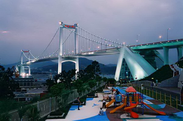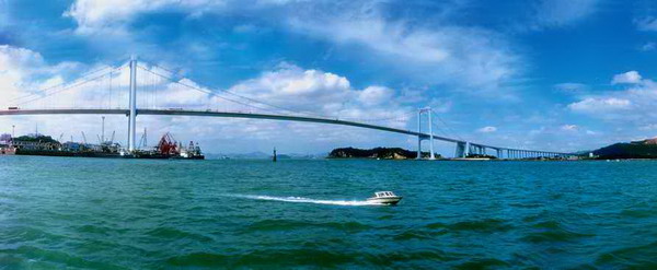 一、工程概况 厦门海沧大桥位于厦门东渡港和海沧投资区之间的西海域上,是继厦门大桥后厦门岛对外的第二条通道。大桥西起马青公路,东接厦门市仙岳路与七星路交叉口,全长约6419m,其东航道桥为亚洲第一、世界第三座三跨连续飘浮体系钢箱梁悬索桥,桥长1108m,桥跨布置为(230+648+230)m。全线按双向六车道高速公路标准建设,计算行车速度80km/h,桥面宽度32m。工程概算28.7亿,于1996年12月开工,1999年12月建成通车,比计划工期提前12个月,节省投资24%。该桥是国家九五重点建设项目。 二、新技术应用与科技创新 1、海沧大桥东航道桥为世界第三、亚洲第一的三跨连续飘浮体系钢箱梁悬索桥,结构特点多,性能好,行车舒适。为避免采用在索塔处设置了液压式钢箱梁竖向约束装置,结构复杂,养护费用高。采用了全漂浮体系,钢箱梁在索塔处不设竖向和扭转方向限位装置。 2、在设计方案考虑城市因素复杂,桥型布置及引桥布置都具有明显特色,交通流畅,养护方便。厦门海沧大桥是国内第一座系统地进行桥梁景观研究与设计的特大型桥梁,从总体线形、结构造型、景观色彩等多方面保证了大桥与自然环境的和谐。 3、悬索桥的锚碇基础国内首次采用倒坡箱形浅埋扩大基础(软弱地基)。采用创新的浅埋倒坡箱形扩大基础并将0.5MPa强风化软质岩作为基底持力层,创新的箱形基础既减轻恒载又优化了基础应力的分布,比沉井方案减少基坑挖方7万方、混凝土3.3万方,缩短工期7个月。采用创新理念的基底倒坡,免费增加了13%的锚碇抗滑安全度,开创了全新的重力式锚碇基础型式。锚碇基础采用分块浇筑并设置后浇段,成功地解决了超大型基础的温度与收缩开裂问题。 4、亚洲首次采用空腹三角形框架结构锚碇。由于结构体系和支承边跨加劲梁的需要,三跨悬索桥边跨主缆散索点需设置在较高的位置,设计中将散索鞍支墩与锚体结构合二为一,并设计成三角形框架式锚体结构,增加了锚碇的抗倾覆能力,比传统的实腹式锚体节省混凝土约40%,也大大减少了基底应力。 三、获奖单位 中交公路规划设计院有限公司,厦门路桥建设集团有限公司,中交第二公路工程局有限公司,广东省长大公路工程有限公司 |