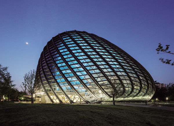 1. 在钢结构的设计上,为实现项目的建筑造型和功能,提出了“双向叠合网格结构”体系,内外钢梁之间的空间被用来安装幕墙系统,钢结构外壳体系同时具有遮阳与雨水收集功能,实现了结构与建筑的完美结合。