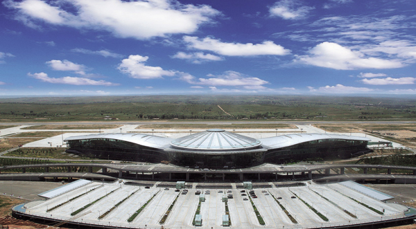 鄂尔多斯机场改扩建工程新航站楼工程位于内蒙古自治区鄂尔多斯市伊金霍洛旗乌兰木伦镇境内,紧邻阿大线。其±0.00m相当于绝对标高1392.35m。