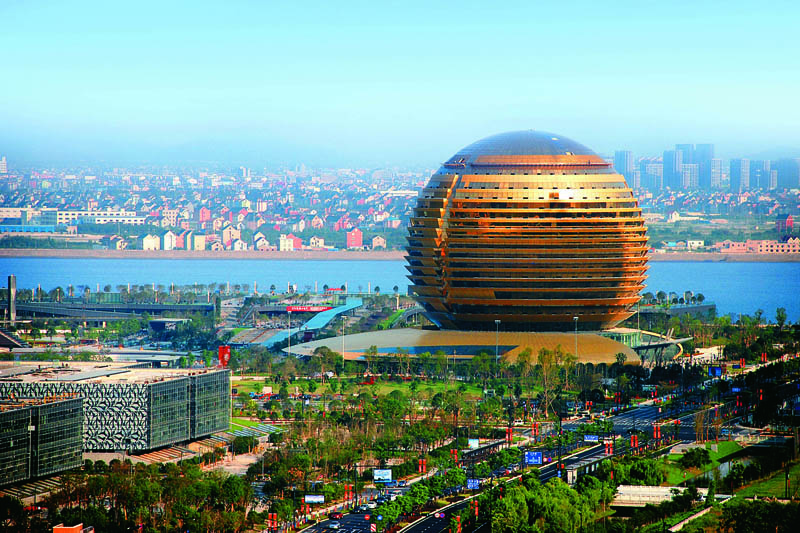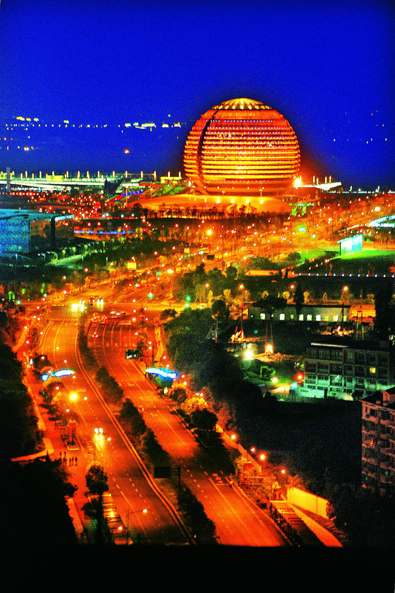 该工程位于杭州市核心区,总建筑面积126296m2,是集会议、餐饮、住宿为一体的大型综合体建筑,由地下室、椭球形裙房、球形主楼三大部分组成,为国内最大的钢结构球形建筑。