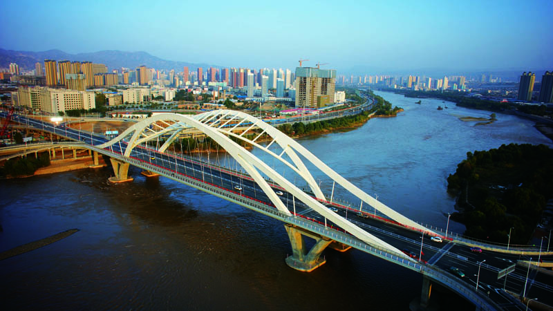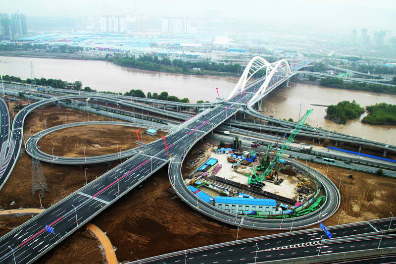 兰州深安黄河大桥为主跨156m的下承式蝶形钢拱叠合梁结构。大桥位于兰州市西固区与安宁区之间,横跨黄河,主线与黄河南岸的南滨河路、黄河北岸的北滨河路互通相交,立交形式为“2个半定向+2个苜蓿叶”的两层完全互通立交,各向匝道共计16条。