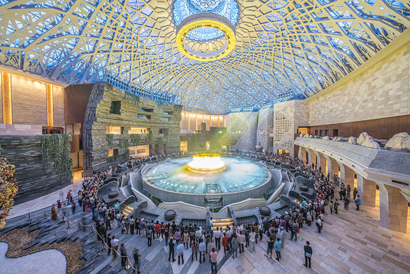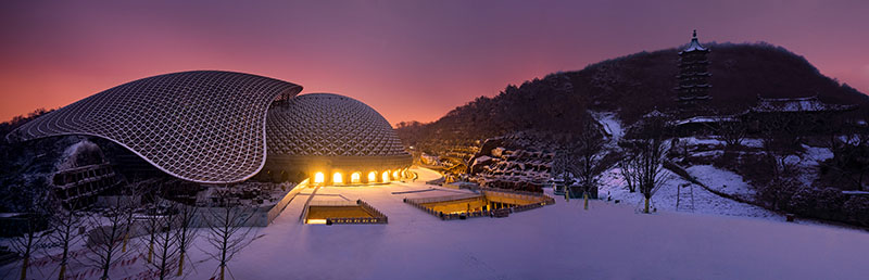 南京牛首山文化旅游区佛顶宫工程,位于牛首山顶由采矿形成的150m废弃矿坑内,总建筑面积13.6万m2,作为佛顶骨舍利的永久供奉地点,是一个集文化、旅游、宗教、建筑等元素于一体的大型现代宗教建筑项目及世界佛教圣地。