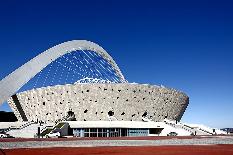鄂尔多斯市东胜区全民健身活动中心体育场位于鄂尔多斯市铁西区,总建筑面积10.05万m2,地上三层,建筑结合内蒙古草原弓箭造型,钢拉索又似琴弦,充分体现了蒙古民族刚柔并济的特质。