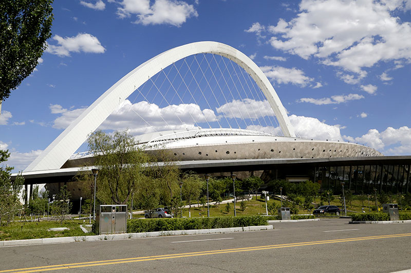 体育场巨拱结构巧妙的采用钢管拱桥的设计理念,通过钢索将屋盖大部分重力荷载传给大拱,使大跨度屋盖桁架高度大大降低,水平荷载则由下部刚度较大的混凝土看台结构承担。屋盖投影呈椭圆形,长轴268m,短轴220m,巨拱高度129m,跨度330m,与地面垂线倾斜6.1°,46根长短不一的拉索,采取分段张拉方案,实现了整体受力平衡。开合屋盖10076.2m2,为国内规模最大的开闭顶,设观众席5万座。体育场幕墙外倾28°,12500块异形人造石材规格各异,在不同时段、不同光照下呈现不同的立面效果。该体育场拥有目前国内规模最大的开闭顶,是一座集体育竞赛、全民健身、休闲娱乐于一体的综合性建筑。