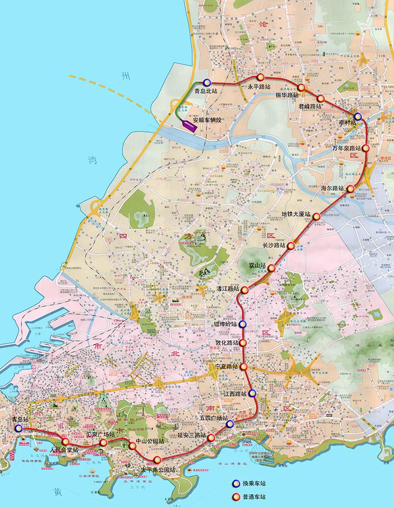 青岛市地铁3号线工程线路全长约为24.8km,全部为地下线。设车站22座、安顺路车辆基地1座、控制中心1座。本工程共有换乘车站6座,其中双岛四线换乘车站2座。全线明挖车站14座,暗挖车站7座,明暗挖结合车站1座,全线设区间21个,暗挖工程全部采用矿山法施工。