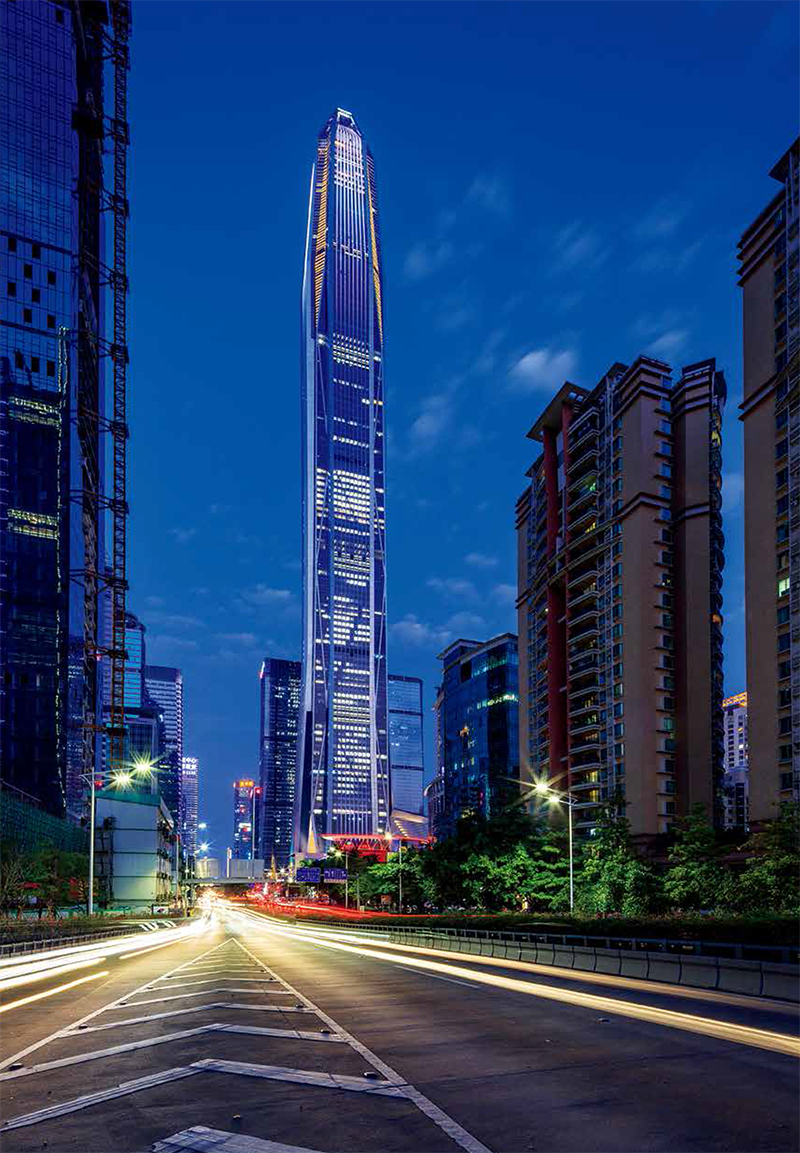 该工程位于深圳市福田中心区1号地块,是一幢以甲级写字楼为主的超高层建筑,总建筑面积459187m2,由主塔楼、商业裙楼和5层整体地下室组成。主塔楼地上118层(600m),是世界第四、中国第二高楼;濒临南海、台风频发,外立面采取对称、锥形、针状向上延伸,可减少32%倾覆力矩和35%风荷载。结构创新性采用“巨柱-核心筒-外伸臂”抗侧力体系;核心筒为钢骨-劲性混凝土,外框为8根巨型钢骨混凝土柱(6525mm×3200mm),单柱单桩承载力高达70万kN,整体用钢量超过10万t,C70/C60高强混凝土16.5万m3。