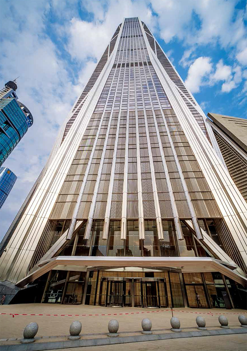 9.针对外立面美观、耐久、易维护的要求,创新采用高耐腐蚀性能316L不锈钢幕墙。在深圳濒海环境中,可保持外观一百年不变,成为全球最大不锈钢外立面(1700t)的摩天大楼。