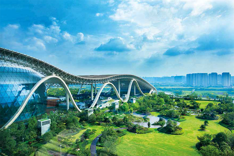 工程设计新颖,庄重宏伟,大气磅礴。回声抑制和噪声监测技术首次在国内展馆建筑中综合应用,极大提高了展厅广播语言清晰度,确保观展受众的舒适性。燃气辐射采暖技术首次在展馆类建筑中大面积安全应用,解决了传统对流采暖造成的热空气集聚上部的弊端。6.4万m2屋顶花园采用“海绵城市”理念,形成一套可循环的水生态系统,将传统园林艺术与屋面构筑物完美融合。