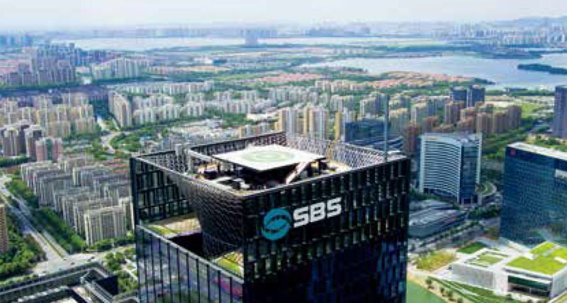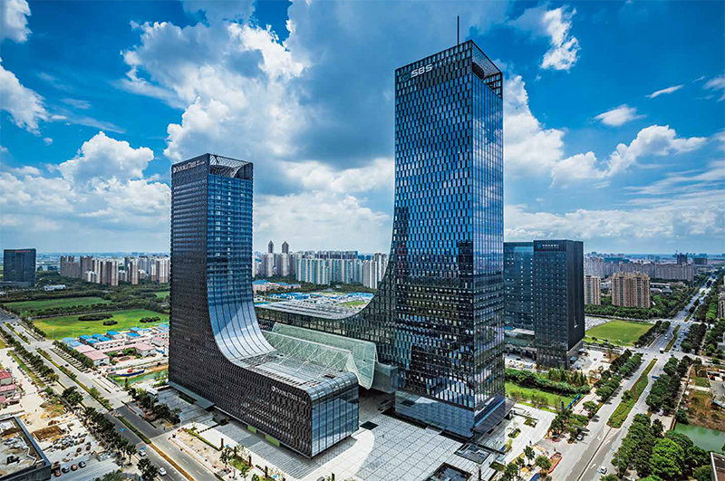 苏州现代传媒广场,一座代表着苏州千年城市文化的建筑新地标,位于苏州工业园区金鸡湖东,总建筑面积33万m2,地下3层,地上43层,建筑高度214.8m,由两幢L形双子塔楼组成,集媒体演播、市民活动及酒店办公为一体的绿色、科技、人文城市综合体。