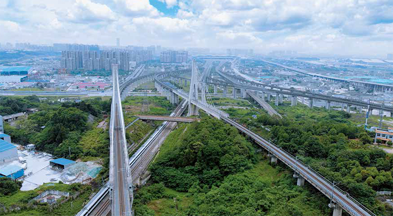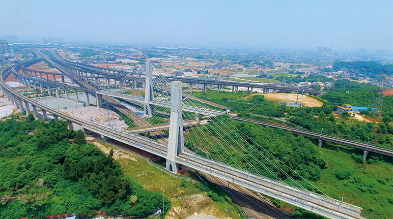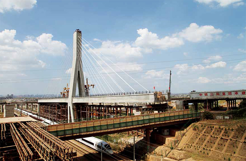 该工程是全国首例高铁跨高铁大跨径独塔非对称双索面转体斜拉桥。在铁路建设领域,该桥创下了六个“第一”:高铁跨高铁桥跨度第一、转体总重量第一、转体梁长度第一、独塔非对称斜拉索在高铁第一次应用、边箱式槽形梁在高铁第一次应用、独塔非对称斜拉索与槽形梁的组合结构在高铁第一次应用。