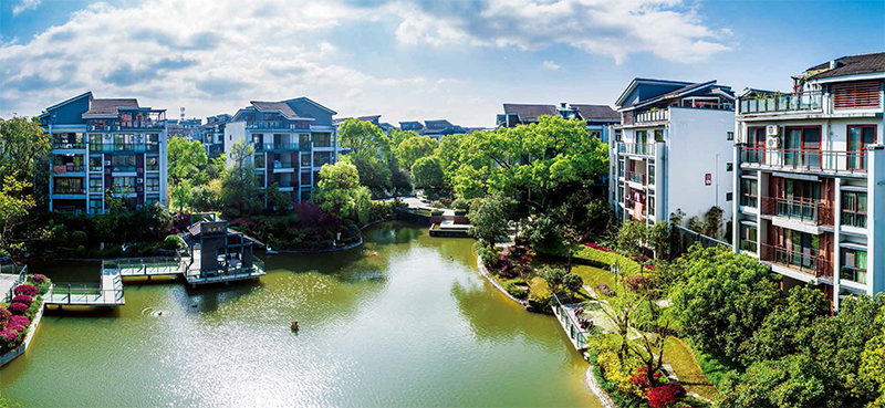 3.采用被动式策略的绿色建筑设计。住宅间距及朝向合理舒适;利用自然风压及天然采光降低能耗;巧妙引入山中溪水,改造原有池塘,造就中心湖泊景观,形成良好的生态自体循环;采用透水砖、鹅卵石铺地,有利于雨水渗透和回收;适度的绿化、高效的绿化维护管理,达到净化空气、控制噪声的效果。