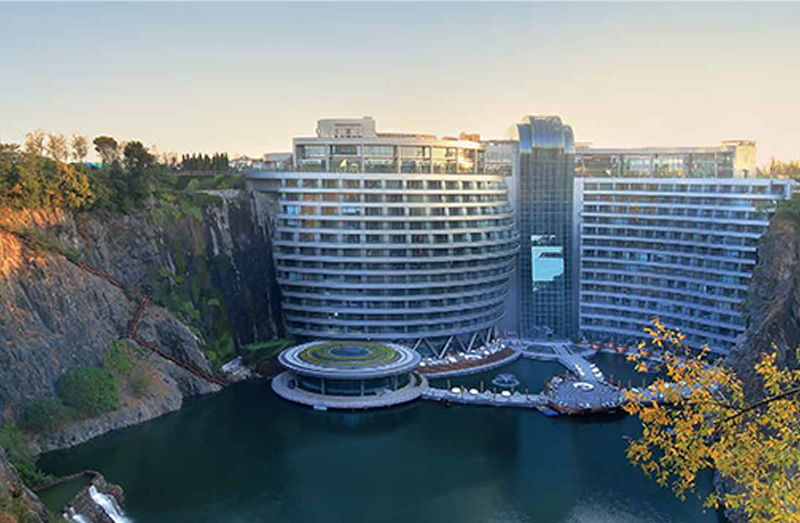 酒店遵循自然环境,一反向天空发展的传统建筑理念,下探地表88m开拓建筑空间。酒店主体自然地“挂”在岩壁上,实现了坑壁和建筑的完美融合,是世界首个建造在废石坑内的自然生态酒店,创造了全球人工海拔最低五星级酒店的世界纪录,被美国国家地理誉为“世界建筑奇迹”。