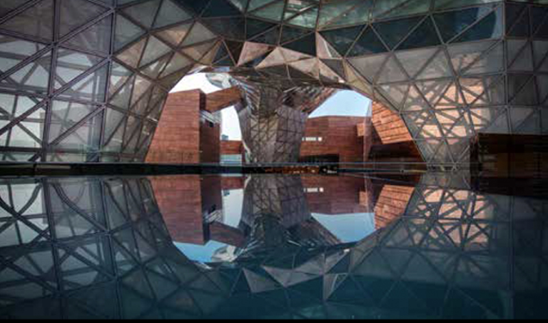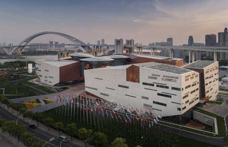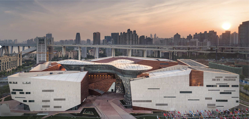 工程地处上海市浦西世博园区,总建筑面积46550m2,地上5层,地下1层,建筑高度34.8m,结构形式主要由钢框架结构、空间网架结构组成。工程由中国设计师原创设计,以大角度、折线形的米色砂岩和铜铝复合板幕墙组成“历史河谷”,唤起世博会160年的历史记忆;中间通透升腾的异型曲面玻璃体——“欢庆之云”,恰似上海世博会的精彩在瞬间绽放;两大意象的叠合,寓意世博文化的过去和未来在这里交织与碰撞,同时记载了上海世博会的建筑元素。