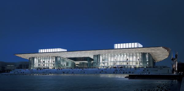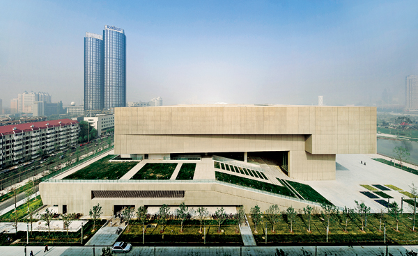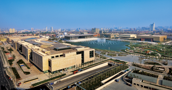 一、工程概况 工程于2006年4月29日开工建设,2010年9月8日竣工,总投资20.6亿元。项目位于天津中心城区南部,占地90h㎡。新建面积92万㎡,地上47万㎡,地下45万㎡,保留建筑8万㎡,合计总建筑面积100万㎡。整体布局利用中心湖形成开敞空间,底景布置大剧院,南侧布置博物馆、美术馆、图书馆,北侧布置市民广场和阳光乐园;区内越秀路下穿通行,广东路延长线以步行为主,建设四条地铁线,一处公交首末站;3个地面停车场及多个地下车库出入口和出租车落客点。 天津大剧院建筑面积9万㎡,地上5层,地下1层,高32m。由综艺剧场(1600座)、音乐厅(1200座)和多功能厅(400座)组成,室外临水平台提供了半室外的观景及临演场地。 天津图书馆建筑面积5.5万㎡,地上5层,地下1层,高30m。藏书600万册,日读者流量5000人次。阶梯状的露台和如同悬浮的书架组成内部空间,外墙石材百叶塑造出透明感十足的立面效果。 天津博物馆建筑面积5.5万㎡,地上5层,地下1层,高30m。馆藏20门类30万件,画册20余万册。以六重门寓意天津设卫建城600年,内部空间用30m宽、14m高、100m长的时光隧道串联各展厅,通过93级台阶直达未来之窗。 天津美术馆建筑面积2.8万㎡,地上4层,地下1层,高30m。设四个长期展厅和多个巡回展厅,进行学术交流培训、美术作品展示、研究和收藏,可收藏珍贵藏品1万件。 阳光乐园建筑面积8.2万㎡,地上5层,地下1层,高30m,是青少年寓教于乐的综合基地。内部空间采用夸张的积木阳台和鲜艳纯粹的色彩,外立面以石材、金属板和玻璃为主要材料,构成连续、均质的图案式建筑表皮。 市民广场建筑面积37万㎡,地上5层,地下2层,高33m。以“日辉、月光、星光、大地”为主题的四个中庭整体效果亲切、宏大,是集购物、餐饮、娱乐、休闲、文化等多功能业态聚合的国际化购物中心。 工程于2009年9月开工建设,2012年3月竣工,总投资139亿元。