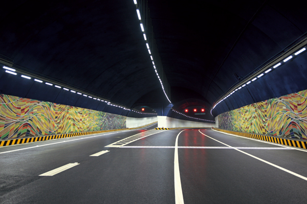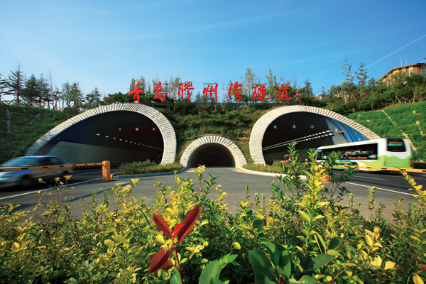 一、工程概况 工程全长9,850m,隧道7.8km,海域段4095m,为目前世界第三长和规模最大的、国内最长的海底公路隧道。两个主隧道加一个服务隧道;共设置17处人行和10处车行横洞,4座雨水和3座废水泵站,3座通风竖井;同步配套了先进的运营设施、6393㎡管理中心和22车道收费站。共开挖土石方约253.8万m³;混凝土73.7万m³。 设计基准期100年;使用功能城市快速路;设计车速80km/h;双向六车道;海域段最小埋深25m;海域段左右主线隧道线间距为55m;主隧道与服务隧道净间距为15m;隧道注浆堵水后控制排水量主隧道不得大于0.4m3/d•m,建成运营后为0.2m3/d•m。初支C35高性能混凝土、防腐锚杆,二衬C50耐久性混凝土。最大断面开挖411.9㎡,覆岩11.7m,岩跨比0.413。主隧道和匝道最小净间距0.2m。机械化配套快速施工最快掘进210m/月,平均月成洞120m。 工程于2007年8月22日开工建设,2011年6月30日竣工,总投资40.59亿元。