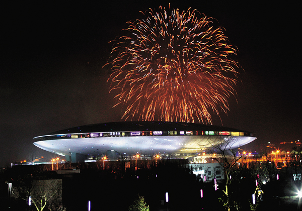 一、工程概况 上海世博会世博文化中心位于世博园核心滨江区,为世博会永久性场馆之一,在世博会期间承担各类大型演出和活动,满足世博会大型文艺演出需求。文化中心以“飞碟”状的穿梭腾飞的形态作为建筑的主体,呈飘浮状地坐落于草坡基座上,轻盈灵动,简洁大气。地面一层基座以大面积草坡覆盖为主,体现与滨江绿带共生的肌理。文化中心用地面积67242.6㎡,总建筑面积140277㎡,其中地上为单层18000座的多功能剧场及环绕主场馆的周边六层建筑,建筑面积为88273㎡,地下建筑为两层,建筑面积为52004㎡。 本工程地上建筑物结构体系主要由三部分组成: ①碟形主体,由E、F、G轴钢管混凝土斜框架柱支承径向大跨悬臂钢桁架;②裙房,框架结构,与主体结构在6.500m标高以防震缝为界;③碟形屋面,标高24.000~41.300m的空间桁架及大跨钢梁。结构总用钢量约3.7万t。大跨度悬臂钢桁架构成了建筑上独特的飘逸造型,其最大悬臂距离达41m。 工程于2008年2月开工建设,2010年3月完成,2010年5月竣工验收,工程总投资23.3亿元。