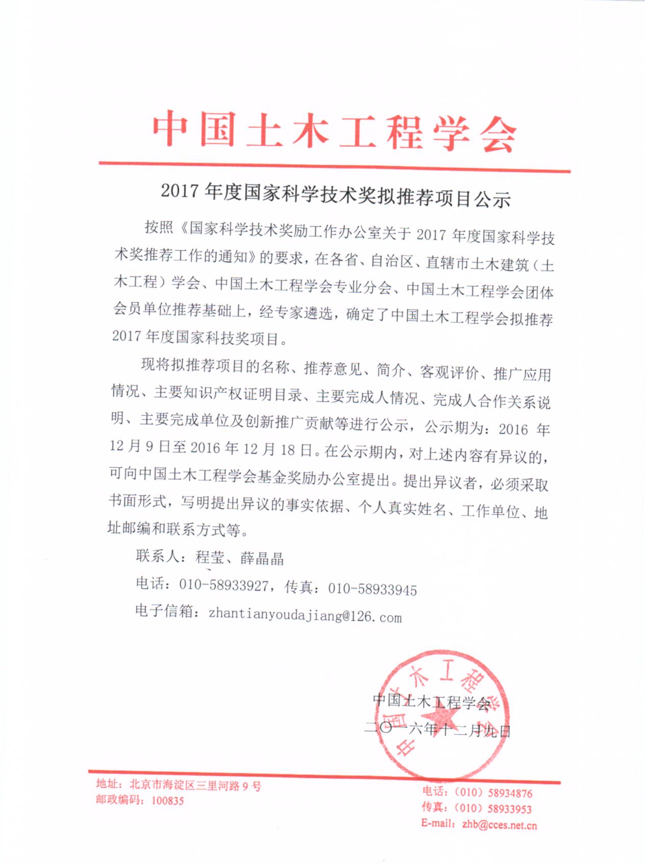 现将拟推荐项目的名称、推荐意见、简介、客观评价、推广应用情况、主要知识产权证明目录、主要完成人情况、完成人合作关系说明、主要完成单位及创新推广贡献等进行公示,公示期为:2016年12月9日至2016年12月18日。在公示期内,对上述内容有异议的,可向中国土木工程学会基金奖励办公室提出。提出异议者,必须采取书面形式,写明提出异议的事实依据、个人真实姓名、工作单位、地址邮编和联系方式等。
