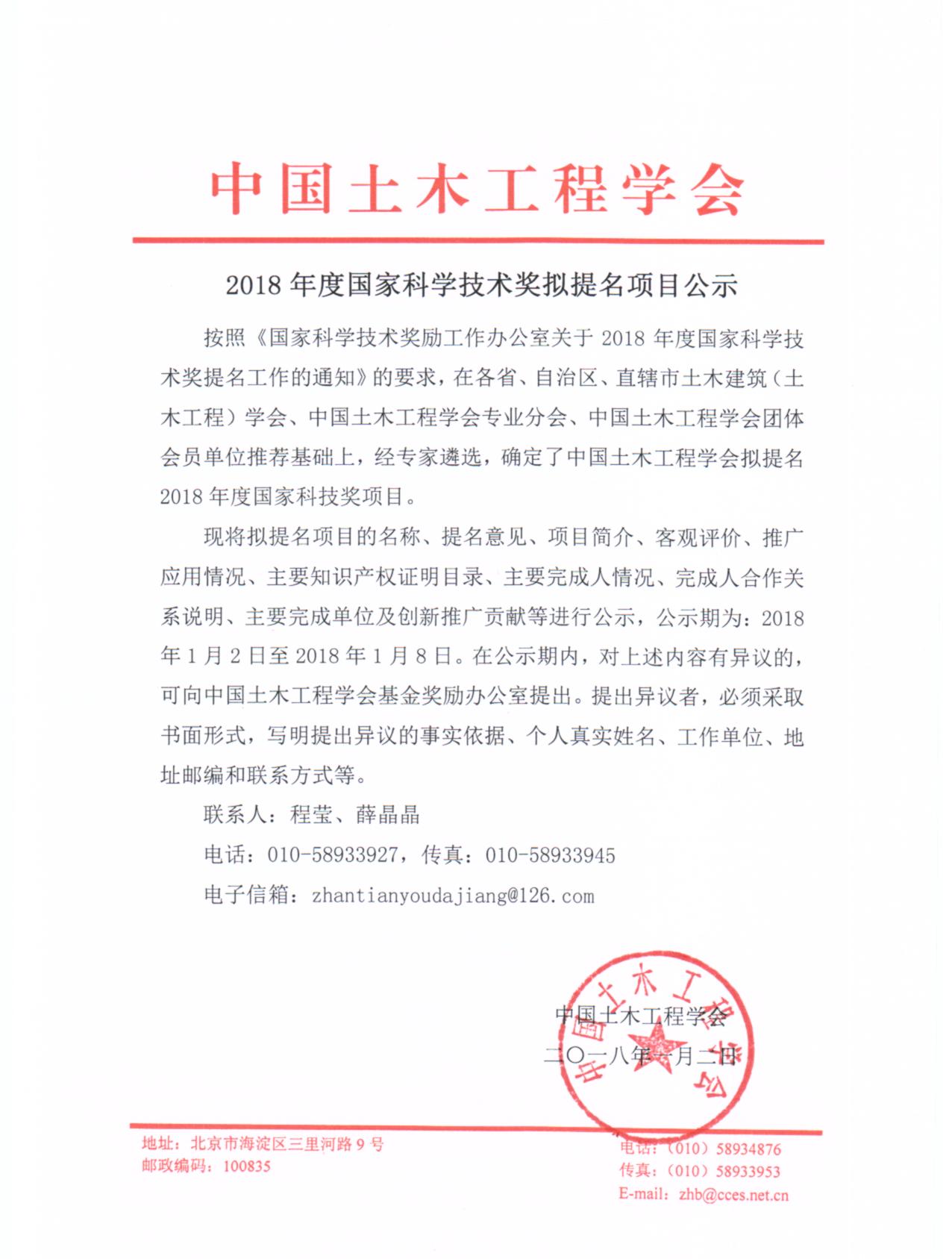 按照《国家科学技术奖励工作办公室关于2018年度国家科学技术奖提名工作的通知》的要求,在各省、自治区、直辖市土木建筑(土木工程)学会、中国土木工程学会专业分会、中国土木工程学会团体会员单位推荐基础上,经专家遴选,确定了中国土木工程学会拟提名2018年度国家科技奖项目。