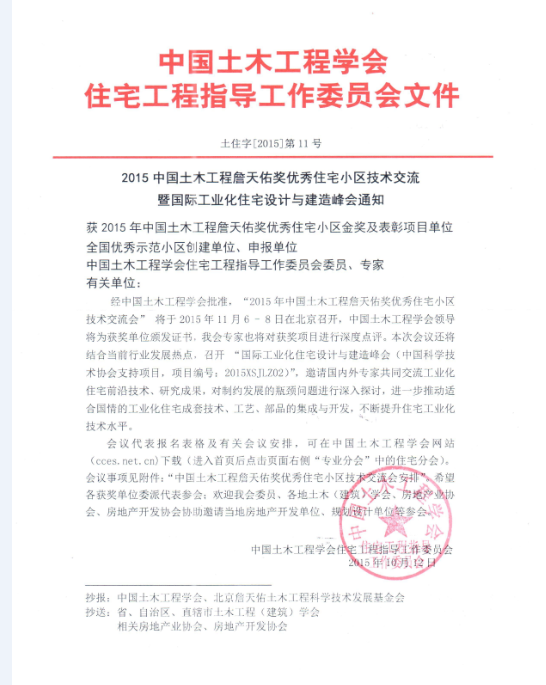 2015中国土木工程詹天佑奖优秀住宅小区技术交流 暨国际工业化住宅设计与建造峰会的通知