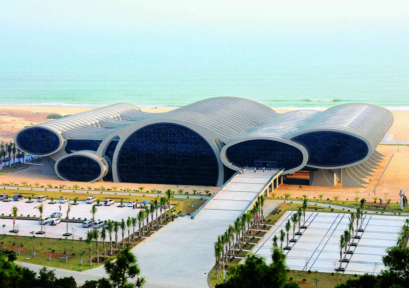 建筑由五个“关联舱体”空间形体组成,整体既似起伏的海浪又如展翅的海鸥,与南海的起伏相互呼应;延绵的曲线隐喻中华悠久灿烂的海上文明。“关联舱体”隐喻古船龙骨结构,建筑外饰面采用外露结构清水混凝土,彰显“砼韵”——古朴、典雅。