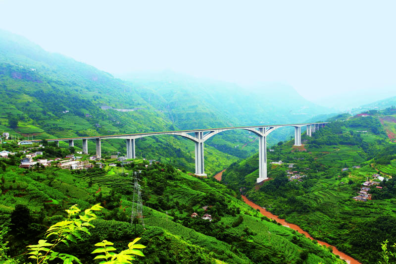 220m+82.5m空腹式连续刚构桥。全长1261m、最大墩高170m。大桥跨越北盘江大峡谷,结构复杂、新颖,规模庞大。