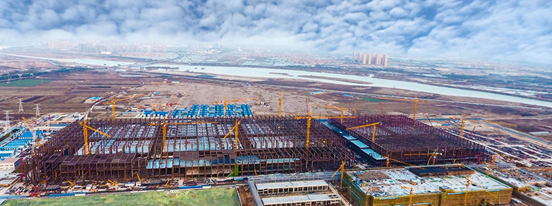 工程是全球最大唯一建设在高烈度区的多层全钢结构超洁净智能环保高科技电子厂房,占地面积57.4万m2,建筑面积71.2万m2,包括生产厂房、动力中心及配套建筑等19个单体。主生产厂房长478m,宽259m,高40m,层数4层,局项目航拍全貌图部5层,总用钢量13.5万t(相当于3个“鸟巢”)。安装工程包括工艺生产、工艺服务、公用动力等6大系统,含核心工艺、净化空调、废气净化、纯水回用等7251套先进设备。