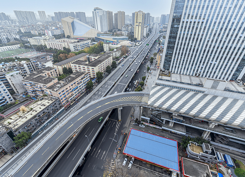 1.成都BRT是国内首例环状高架闭合快速公交系统,成都金沙公交枢纽站、二环高架和2.5环地铁7号线构成了国内外首个“一站双环”交通系统。