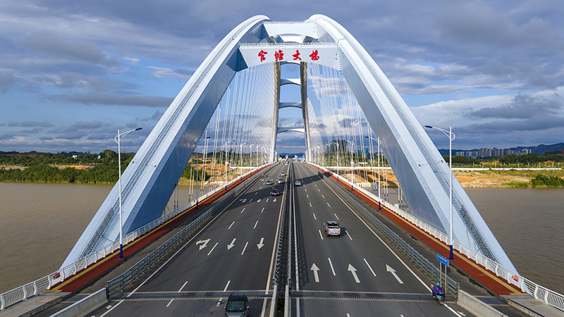 该工程是目前世界第一大跨度有推力钢箱拱桥。结合拱肋节段重、吊装高度高、空间异形对位难、地理环境复杂、施工区域受限、拱座基底与相邻柳江常水位高差大等特点进行技术攻关,研发形成了多项先进技术。