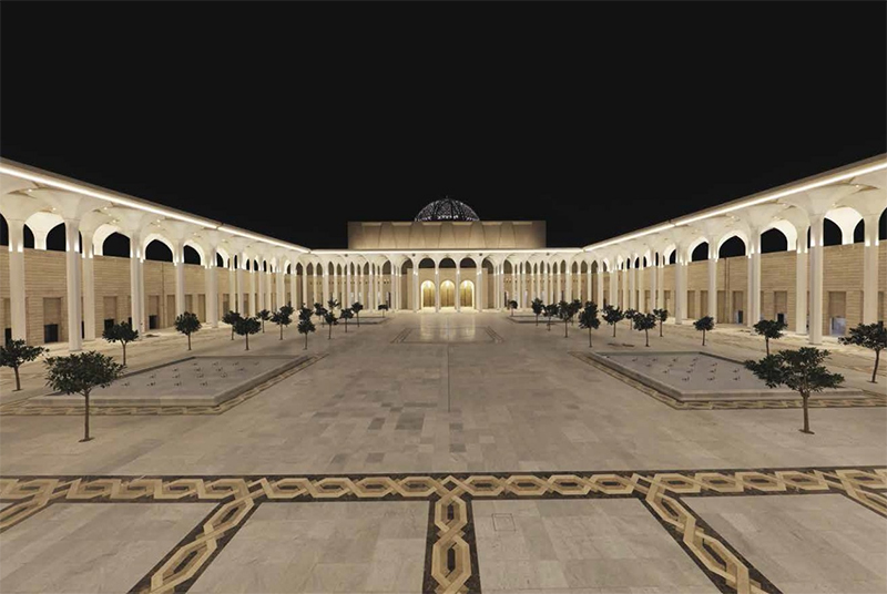 核心单体礼拜大殿占地面积超过 2万m2,建筑面积约 8 万 m2,室内礼拜大殿面积 3.1 万 m2,屋顶为双层穹顶,高度达到 75m。可容纳 3.6 万人,是世界最大的室内礼拜大殿。