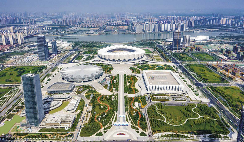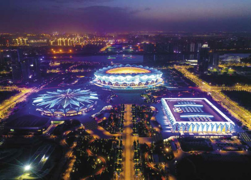西安奥体中心位于西安市国际港务区,东望骊山、西临灞河,呈依山傍水之势,总建筑面积52万m2,由6万座体育场、 1.8万座体育馆和4000座游泳跳水馆组成,是西北地区首个甲级特大型体育场馆群,也是我国中西部地区首次举办全运会的主场馆。项目借鉴中国传统轴线式建筑布局的美学价值,呈品字布局,中轴对称,通过室外道路与城市生态景观完美融合,以新发展理念打造了“双碳”标杆体育公园。