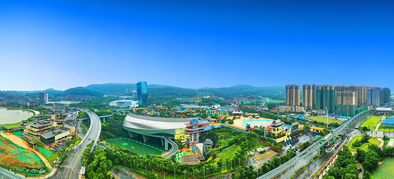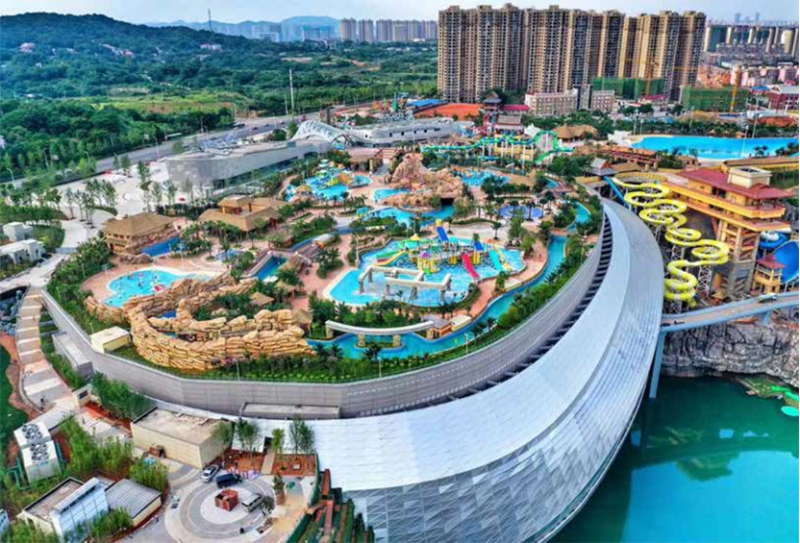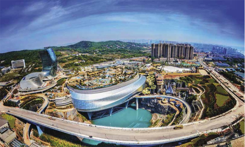矿坑生态修复利用工程——冰雪世界项目位于湘江之滨,依托于一个历经50 年开采而形成的百米深废矿坑建造,是世界首个以矿坑遗址重生为主题建造的大型文化旅游工程。项目采用地景式的设计手法,将主体建筑隐藏于地平线以下,悬浮于矿坑之中,实现废弃矿坑这个“城市伤疤”向文化旅游产业的蝶变升级。项目总建筑面积约 16.8 万m2,汇聚绿色建造、环境保护、高科技应用于一身,同时具有“地质复杂,重载大跨,业态叠加” 等难点。