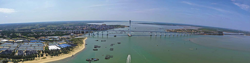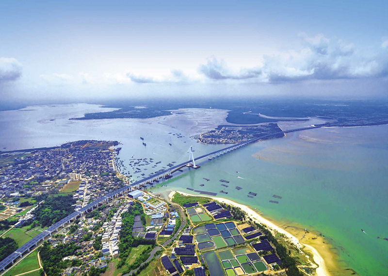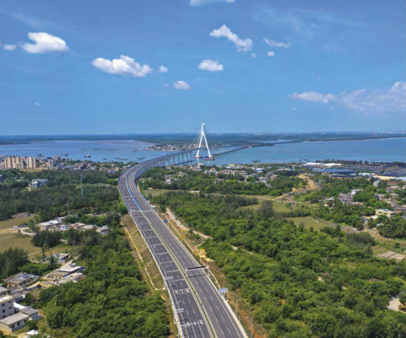 海南铺前大桥(海文大桥)跨越海南岛东北部的铺前湾,连接海口市和文昌市,是国内首座跨越活动断层的跨海大桥,建设时设计地震动峰值加速度国内最高、设计基本风速国内最大,是我国最具挑战性的跨海桥梁建设项目之一。项目全长13.551km,其中跨海大桥长3.959km,桥头引线长1.638km,连接线长 7.954km,双向六车道,通航主桥桥长460m,采用(230+230)m 独塔斜拉桥,主塔为“文”字形钢筋混凝土结构,塔高151.8m。