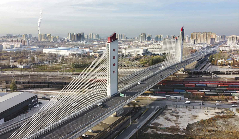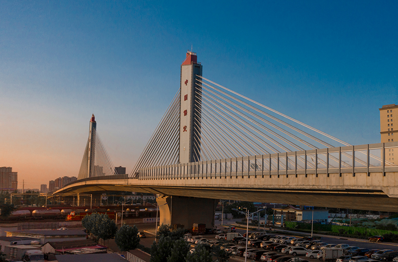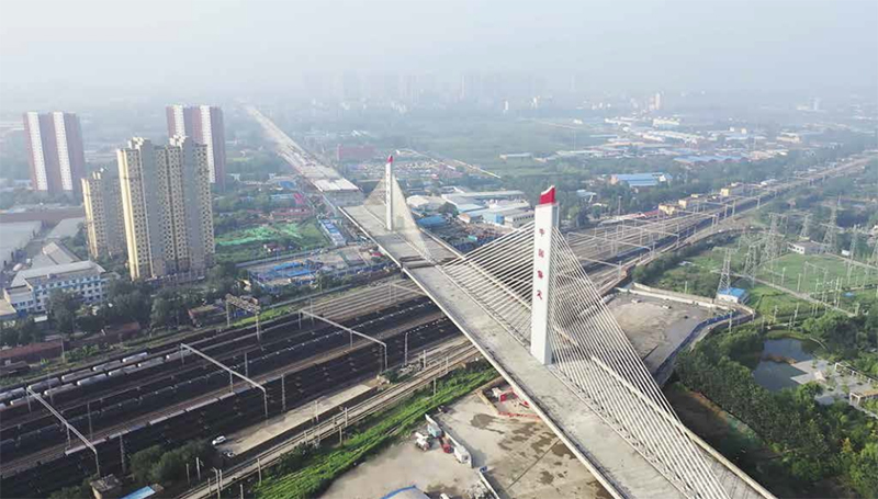 保定市乐凯大街南延工程是保定市第一条高架快速路,线路与京广铁路保定南站以 61.8°相交。跨保定南站斜拉桥主跨跨越京广铁路 21 条股道和 1条城市主干道,双向 8 车道,设计时速 80km。
